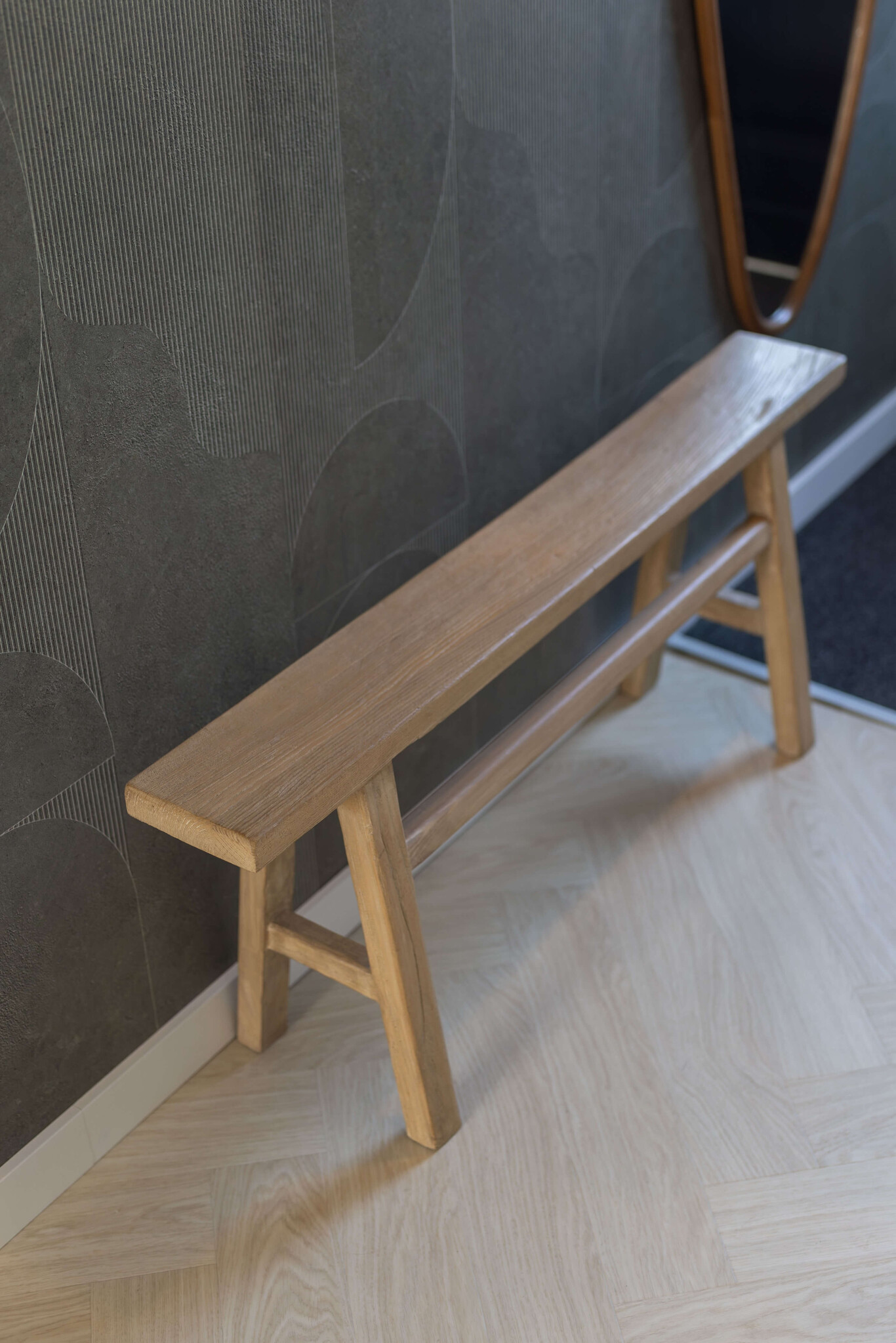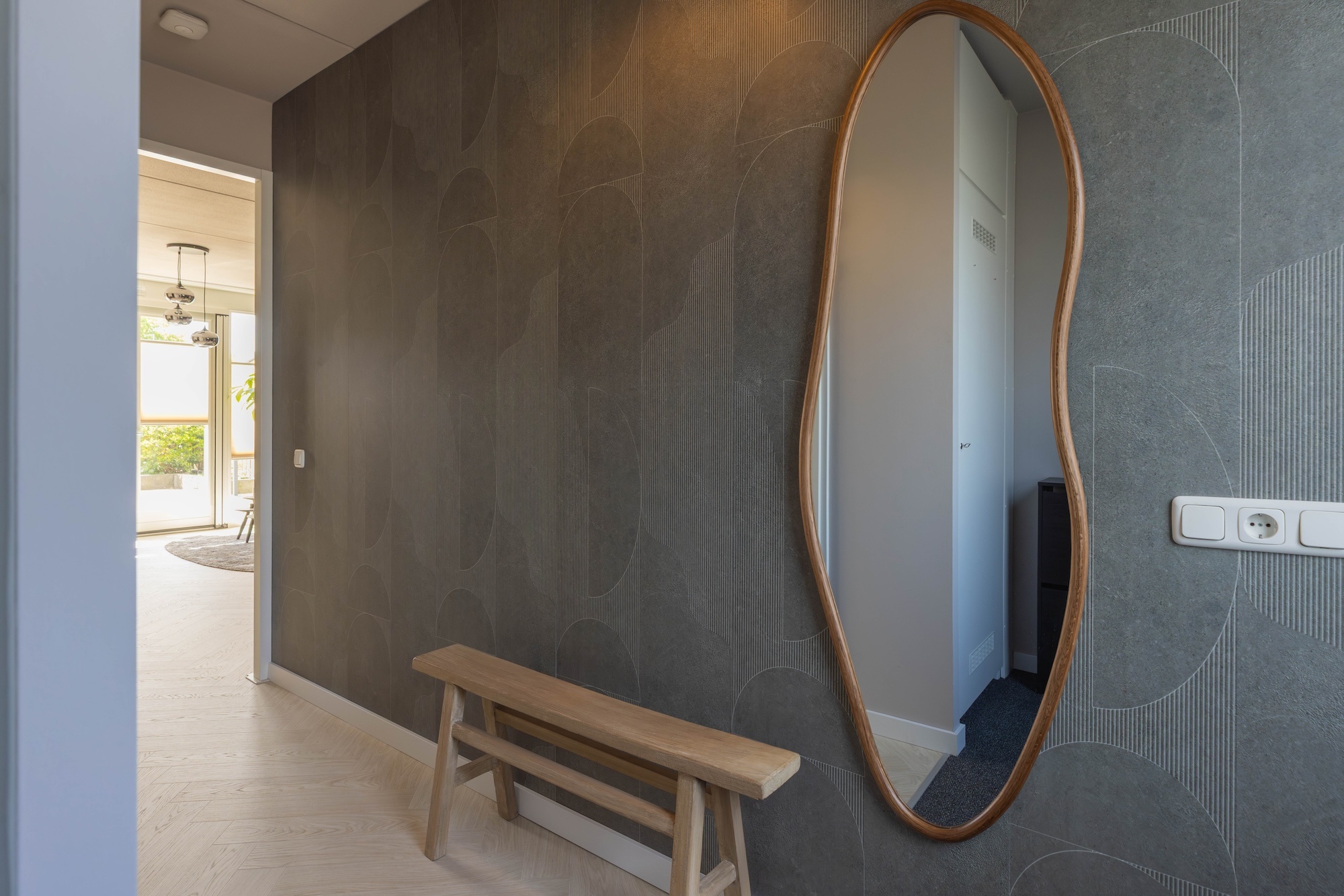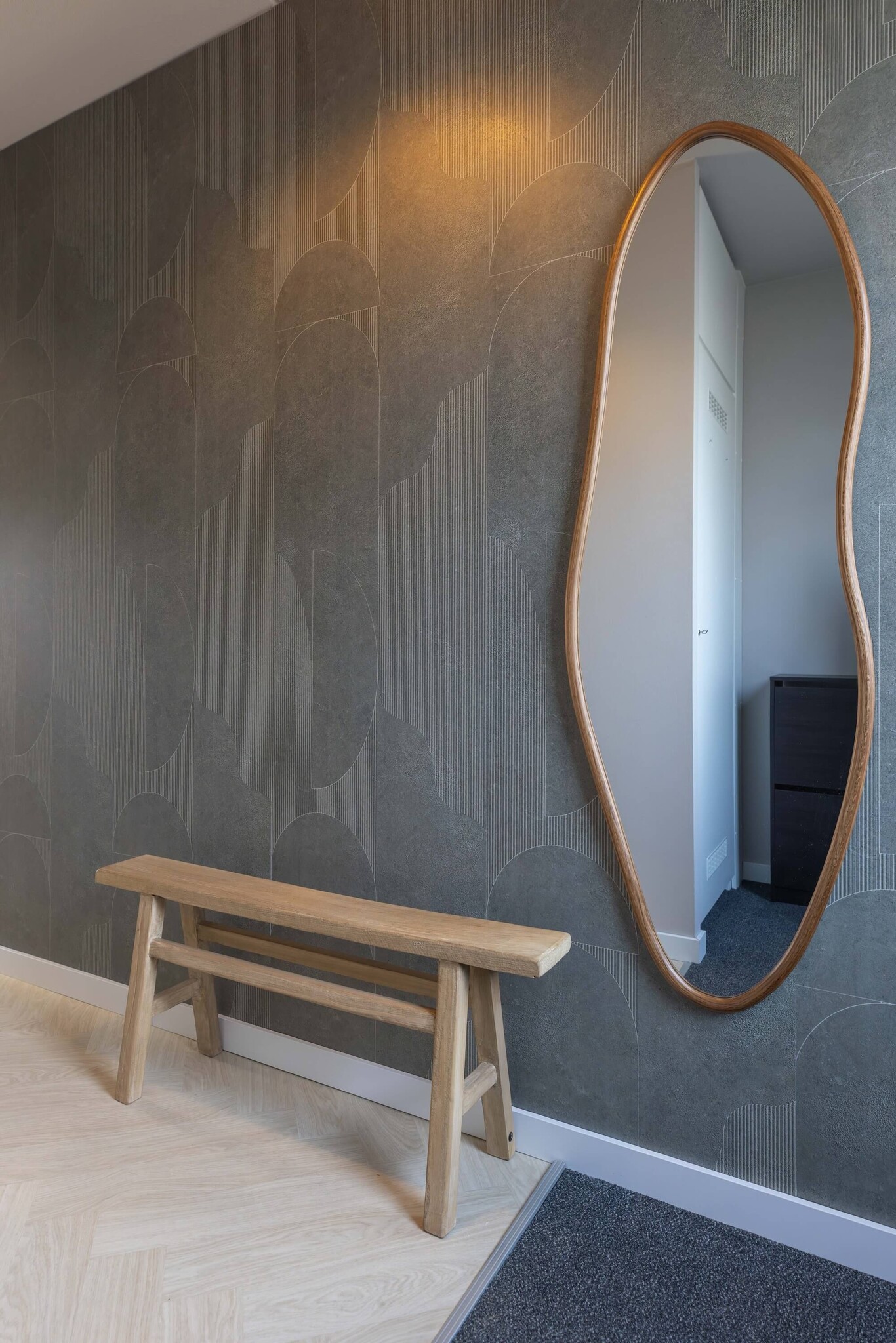 Voor Monique is de hal meer dan slechts een doorgangsruimte. Het is het eerste wat je ziet bij binnenkomst en bepaalt meteen de toon van het huis. Stylist Laura koos daarom voor het verfijnde wandpaneel Nebbia Infinita van Benacci, een subtiele eyecatcher die perfect past bij de zachte, neutrale tinten waar het stel van houdt.