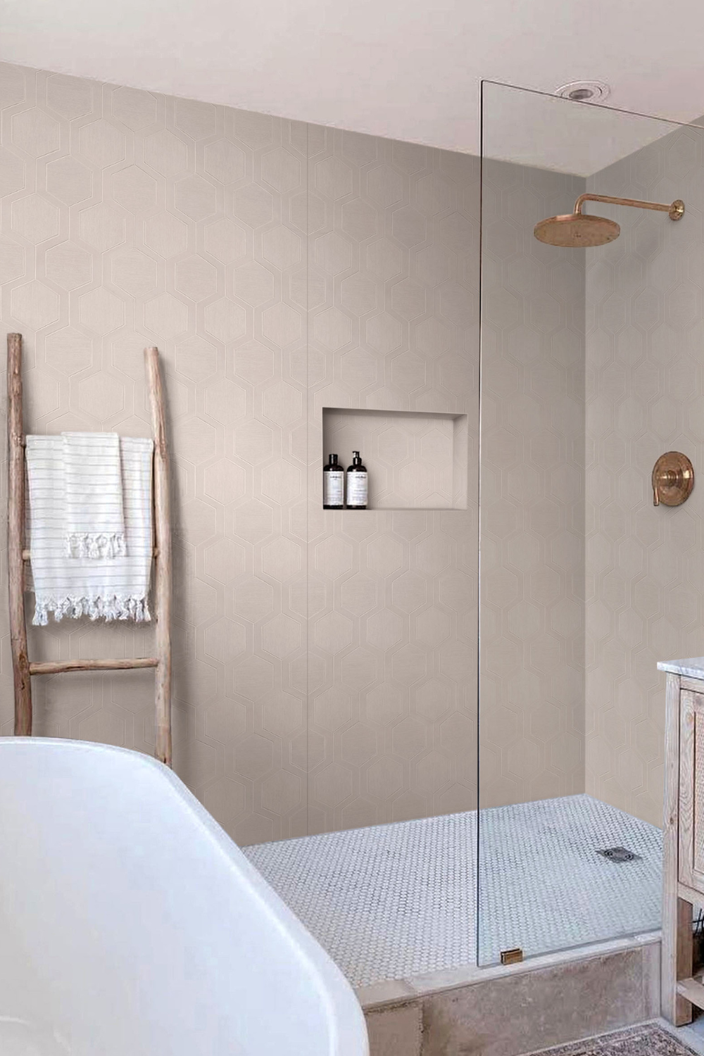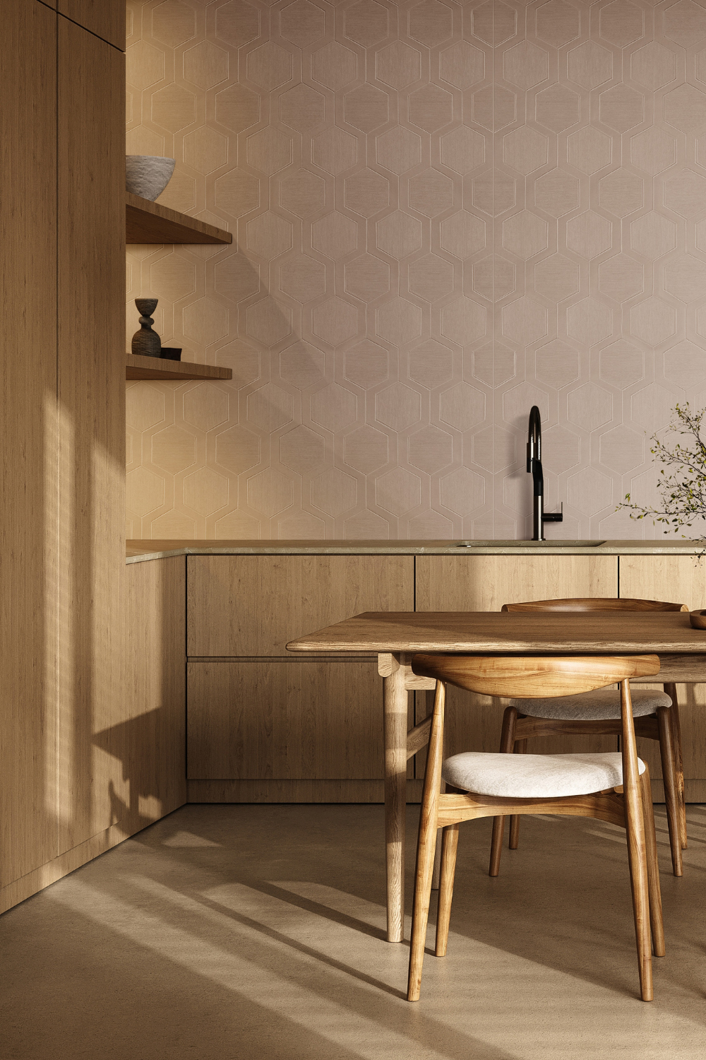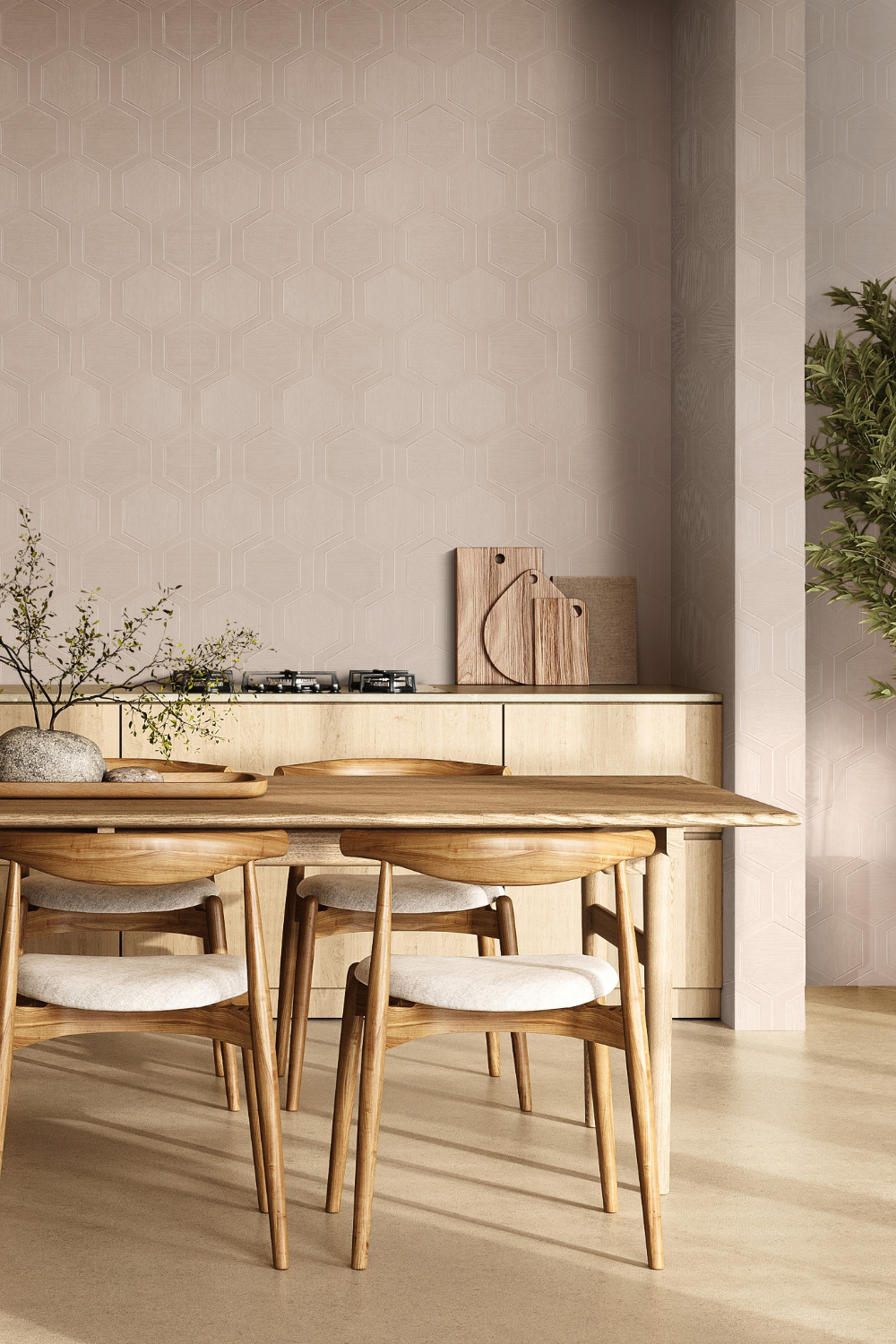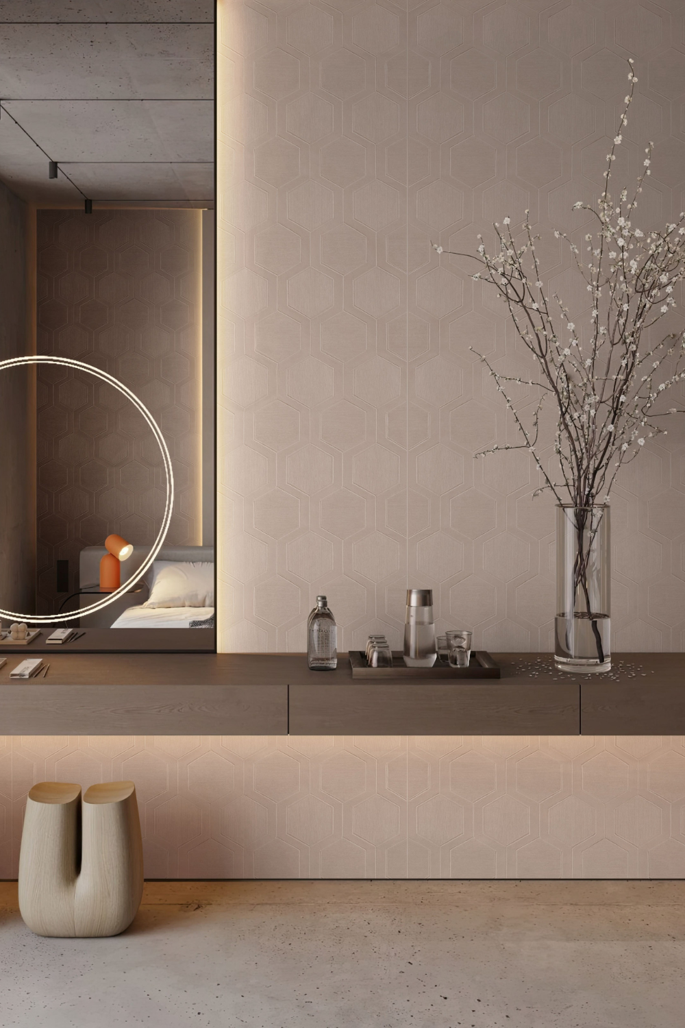 Perla Sagona combineert het subtiele lijnenspel van een hexagonale structuur met de zachte gloed van parelmoer. De nude-achtige tinten zorgen voor een serene uitstraling, terwijl de glanzende textuur een spel van reflectie creëert. Elegant en evenwichtig, voor interieurs die rust en raffinement ademen.