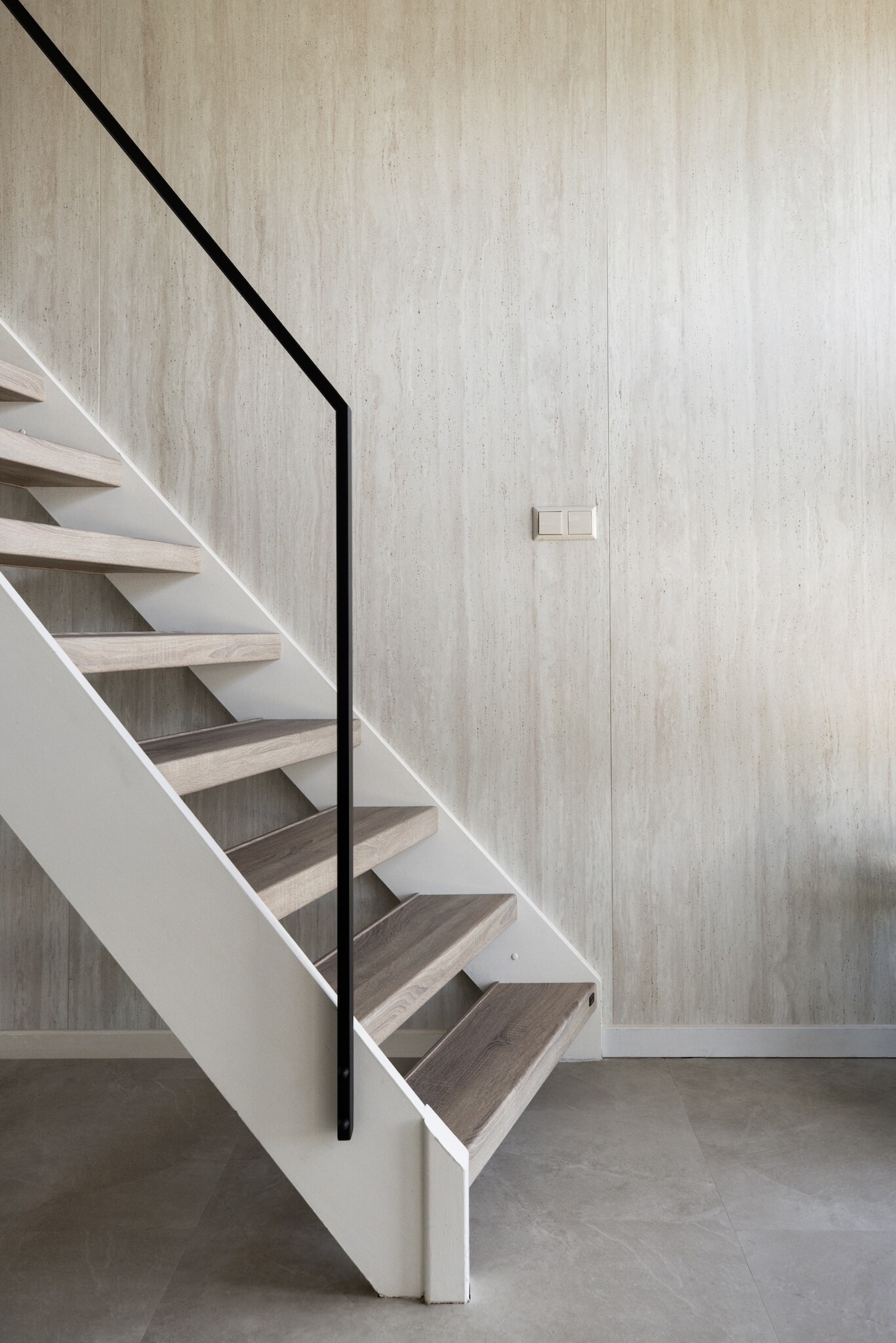 Voorheen voelde de hal vooral functioneel, donker en sfeerloos aan. Geen fijne binnenkomer voor een huis met zoveel karakter. Stylist Marlies zag direct het potentieel en koos voor een opvallende, maar tijdloze oplossing: wandpaneel Travertina Alba.