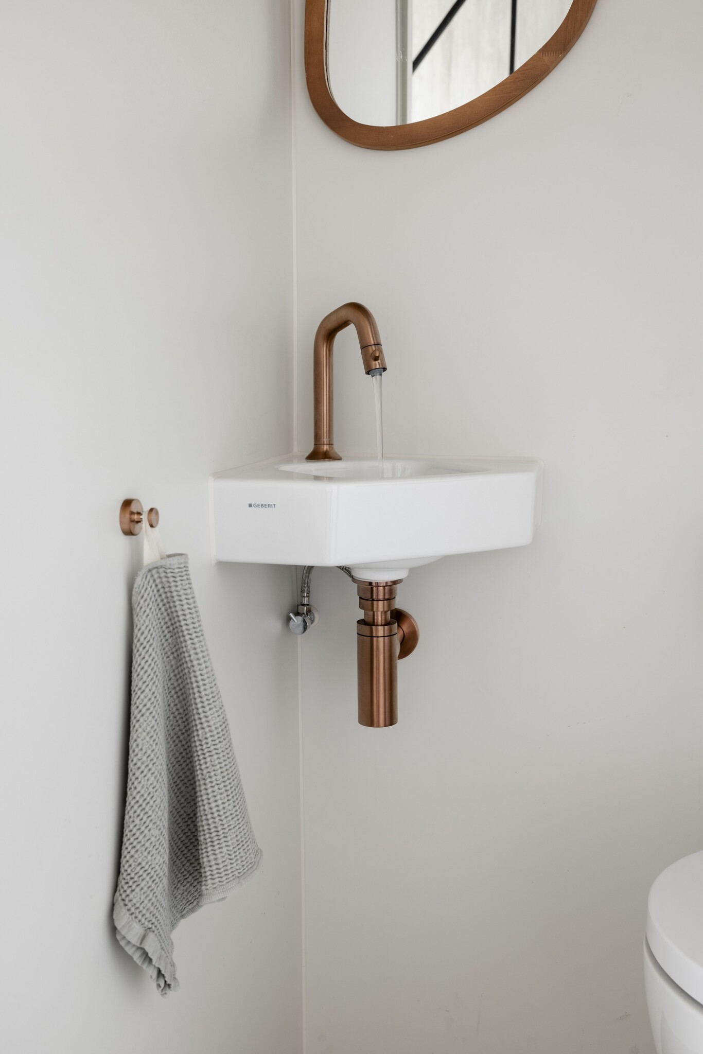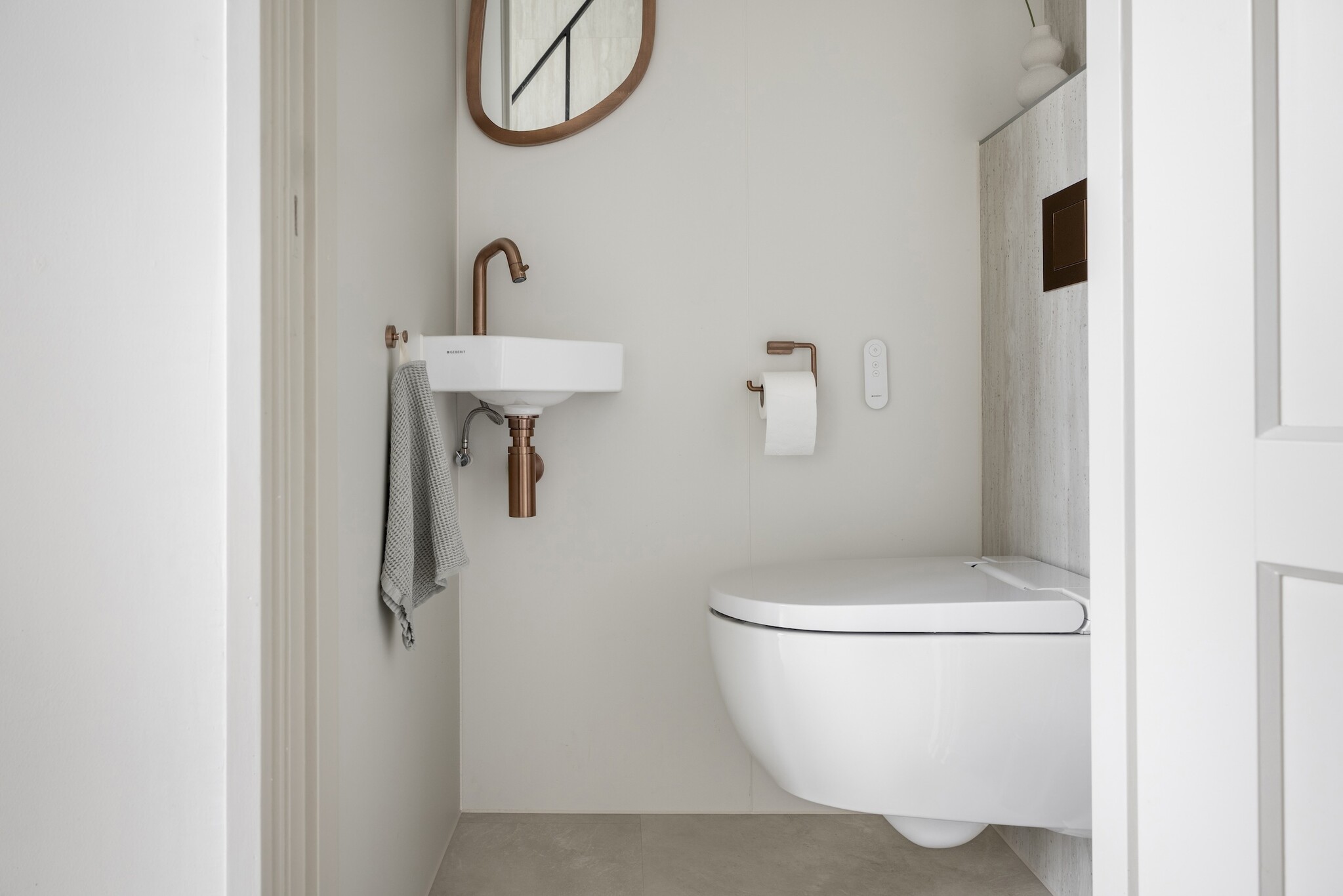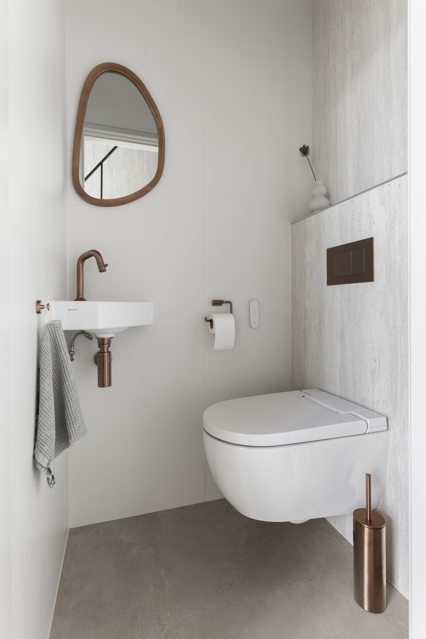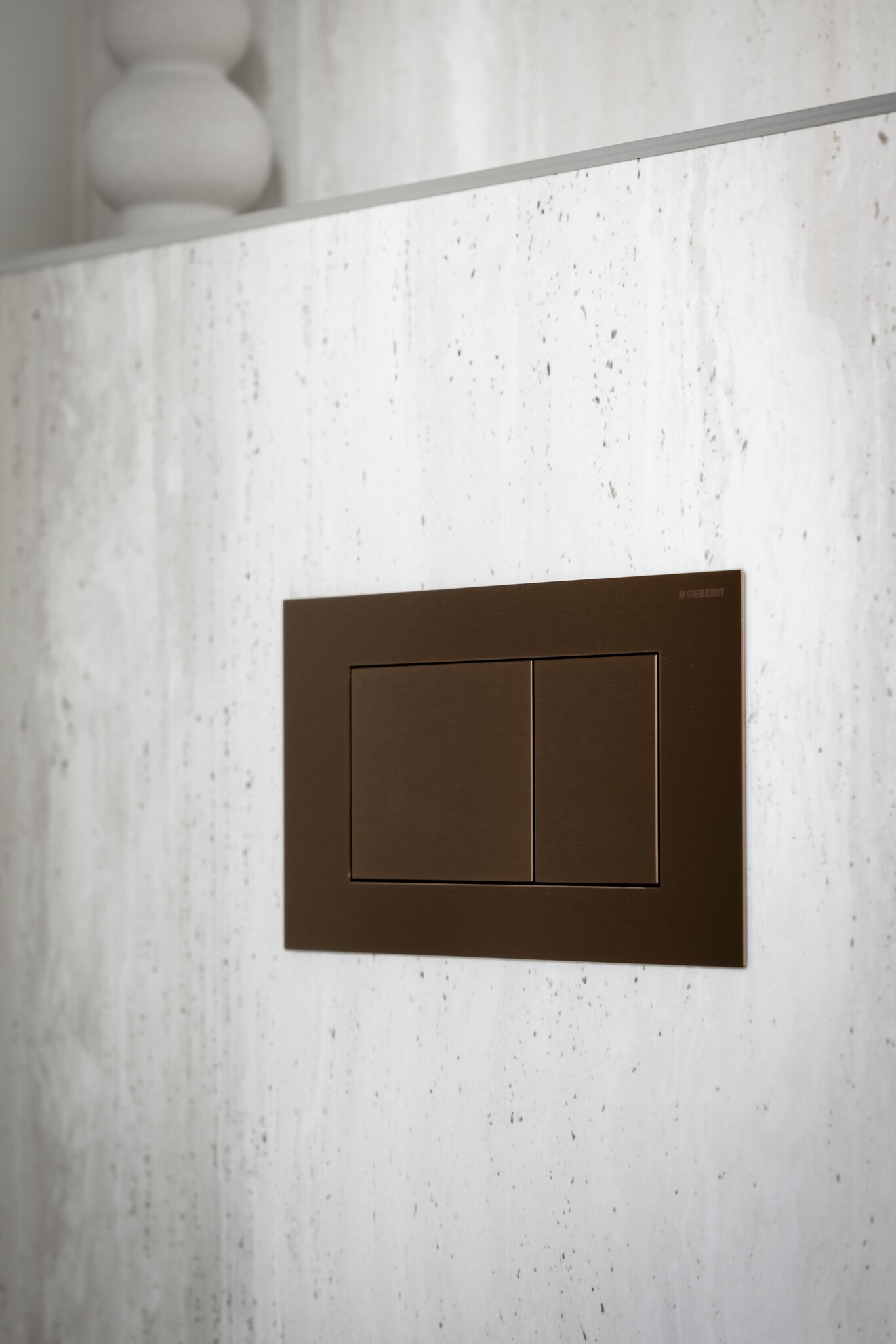 Ook het toilet, direct grenzend aan de hal, werd volledig meegenomen in deze stijlkeuze. Hier is Travertina Alba gecombineerd met het uni-kleurige Mandorla Fino, een ingetogen, warme tint die perfect aansluit bij de rest van het kleurpalet.